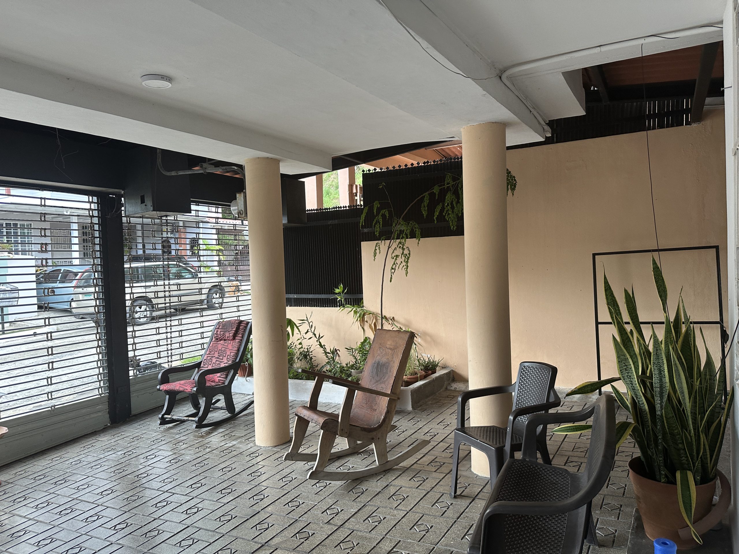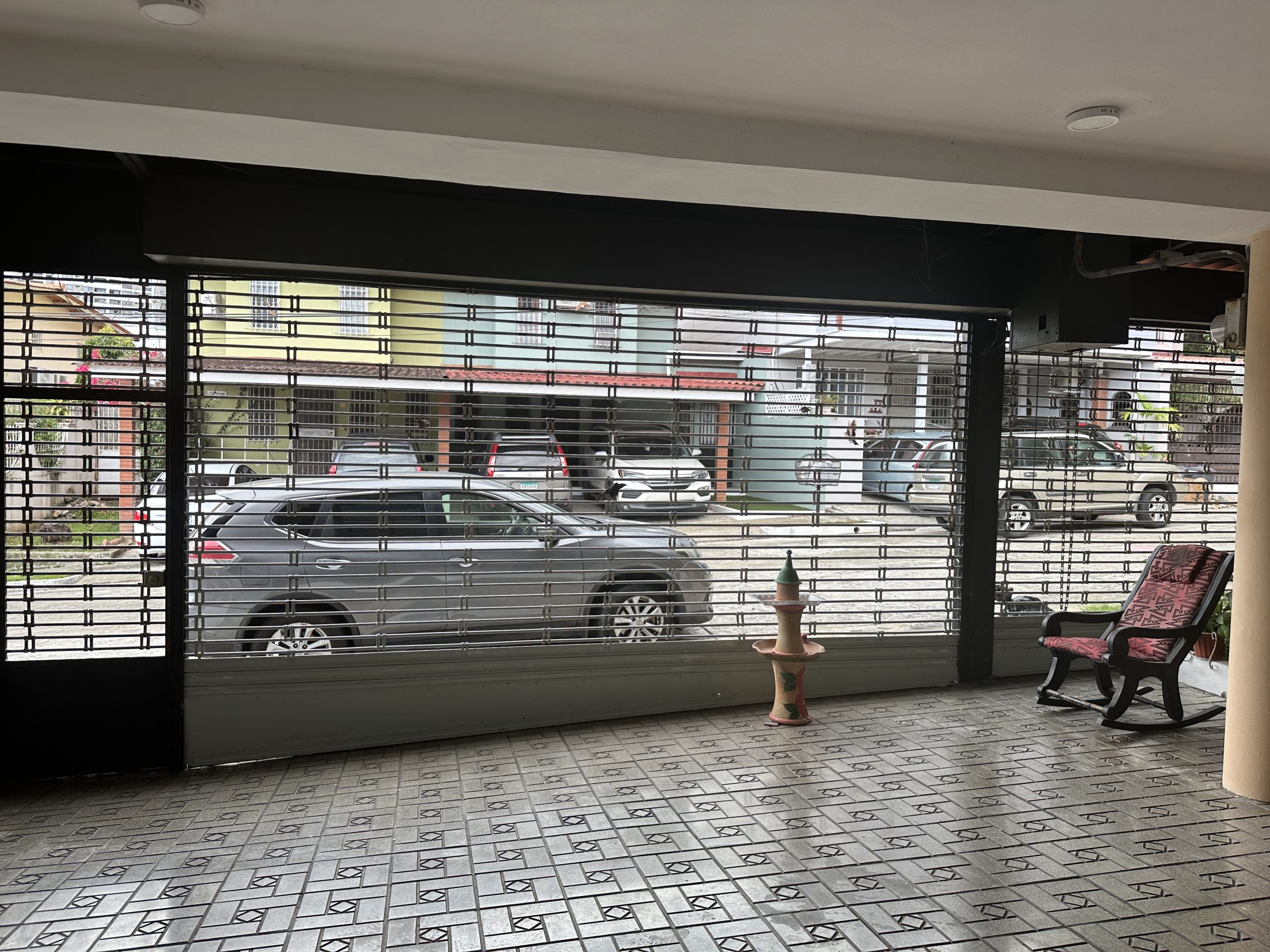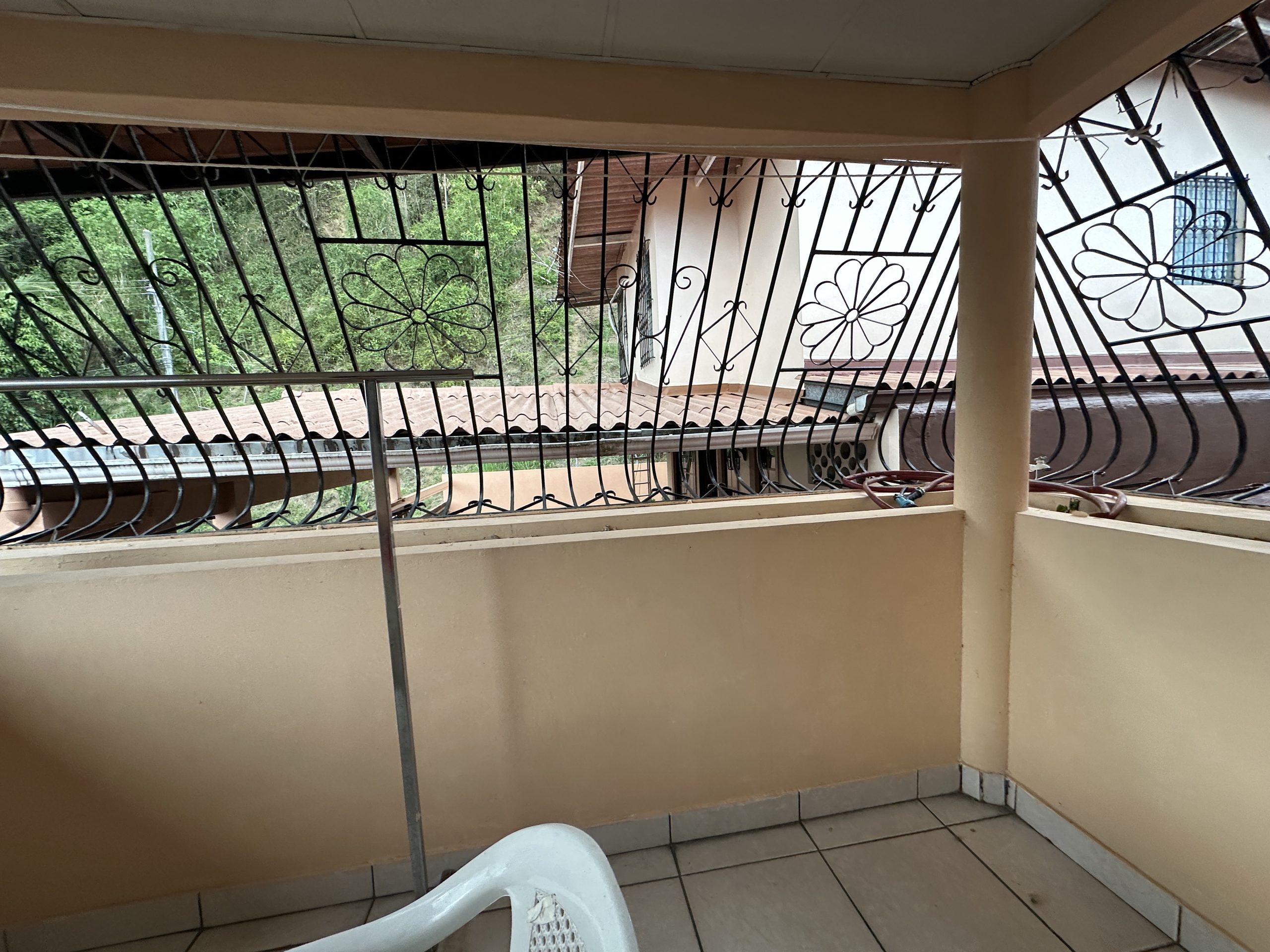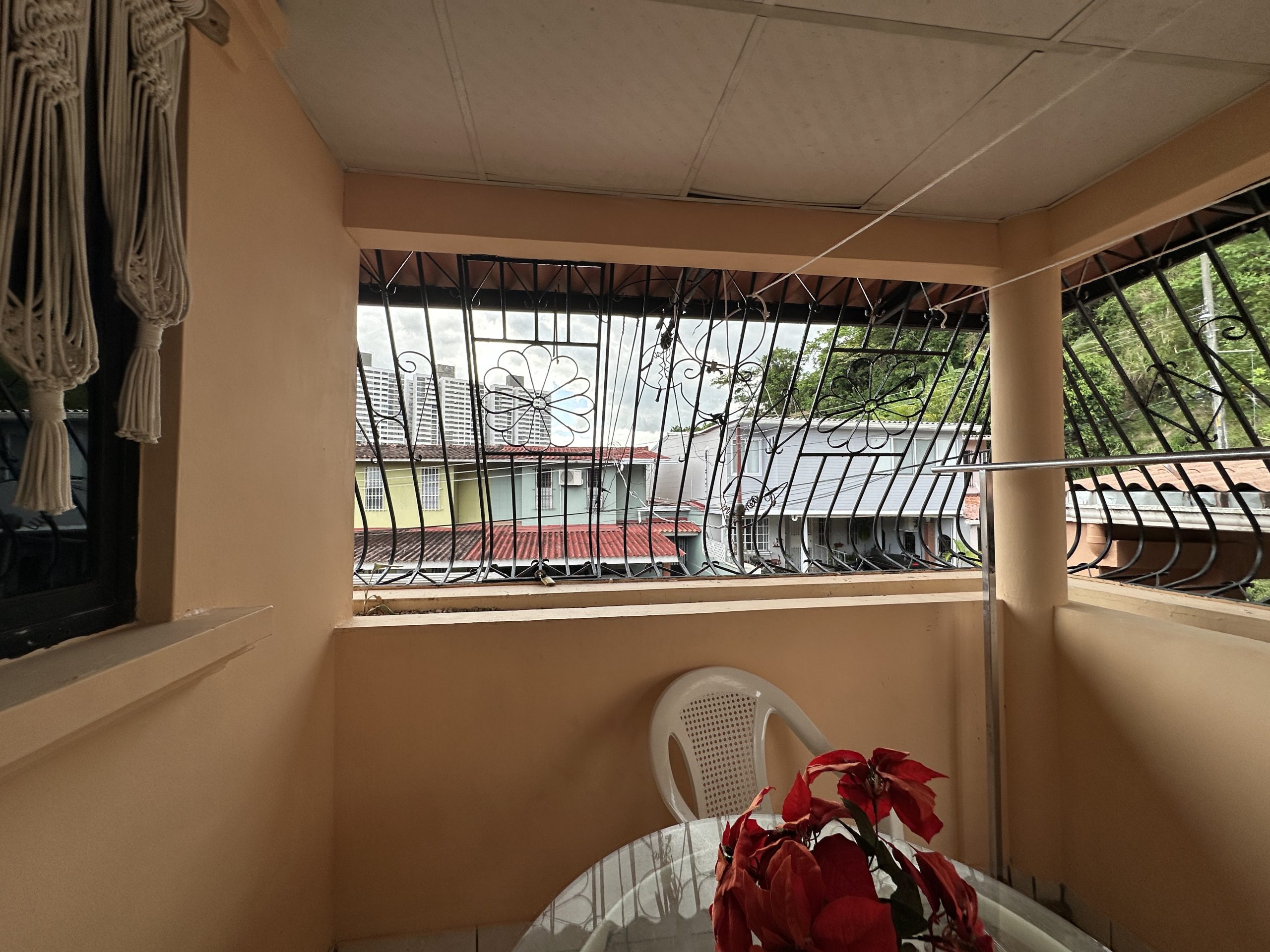 Balcón cerrado con verjas de hierro para seguridad y ventilación.